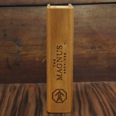 Made of Cherry wood and engraved with our expanded version of the Magnus Archives logo.