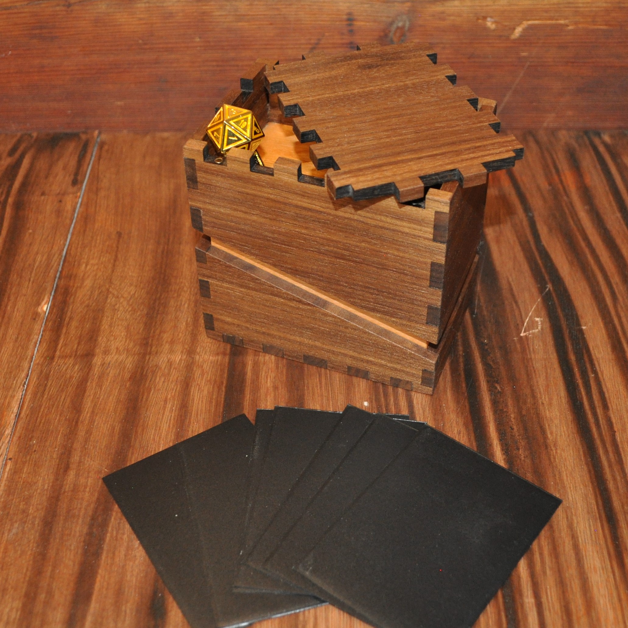 Only fine craftsmanship and friction keep this box secure and your cards safe on your travels. You can fit tokens, counters or d20’s in the storage section.