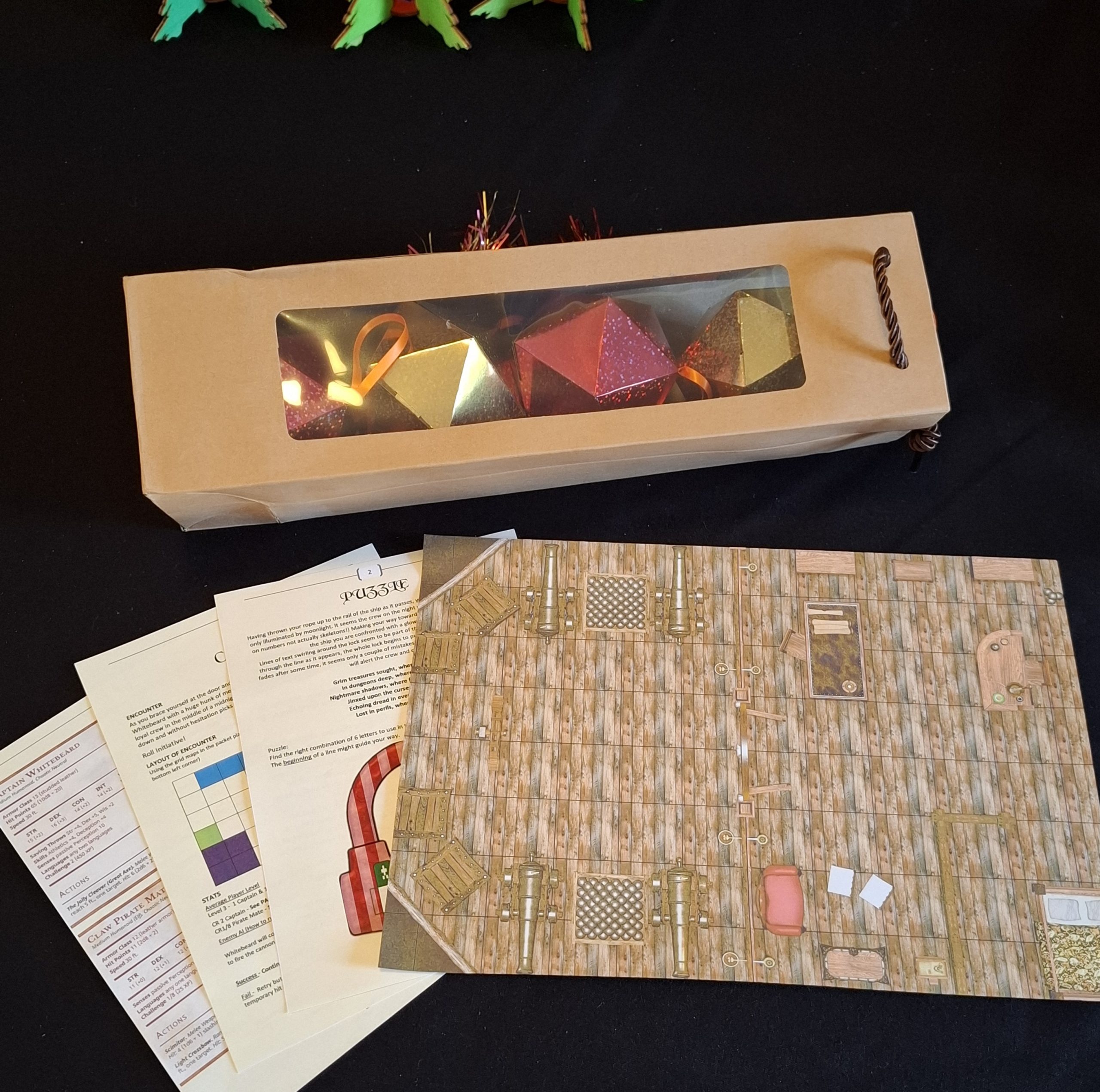 - DM Cracker: Contains a set of RPG dice, adventure miniatures, a Christmas hat, and a fun holiday joke and all essentials for running the game.