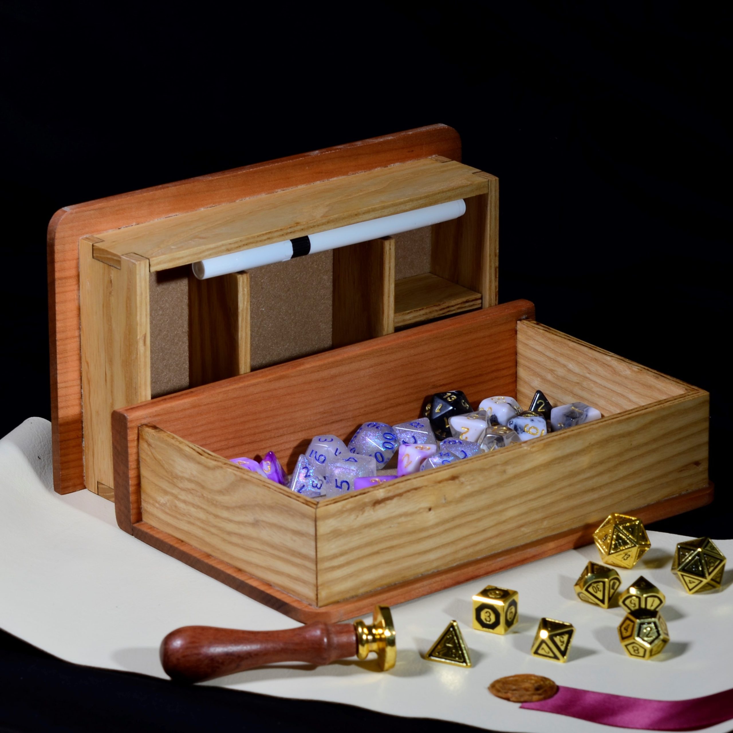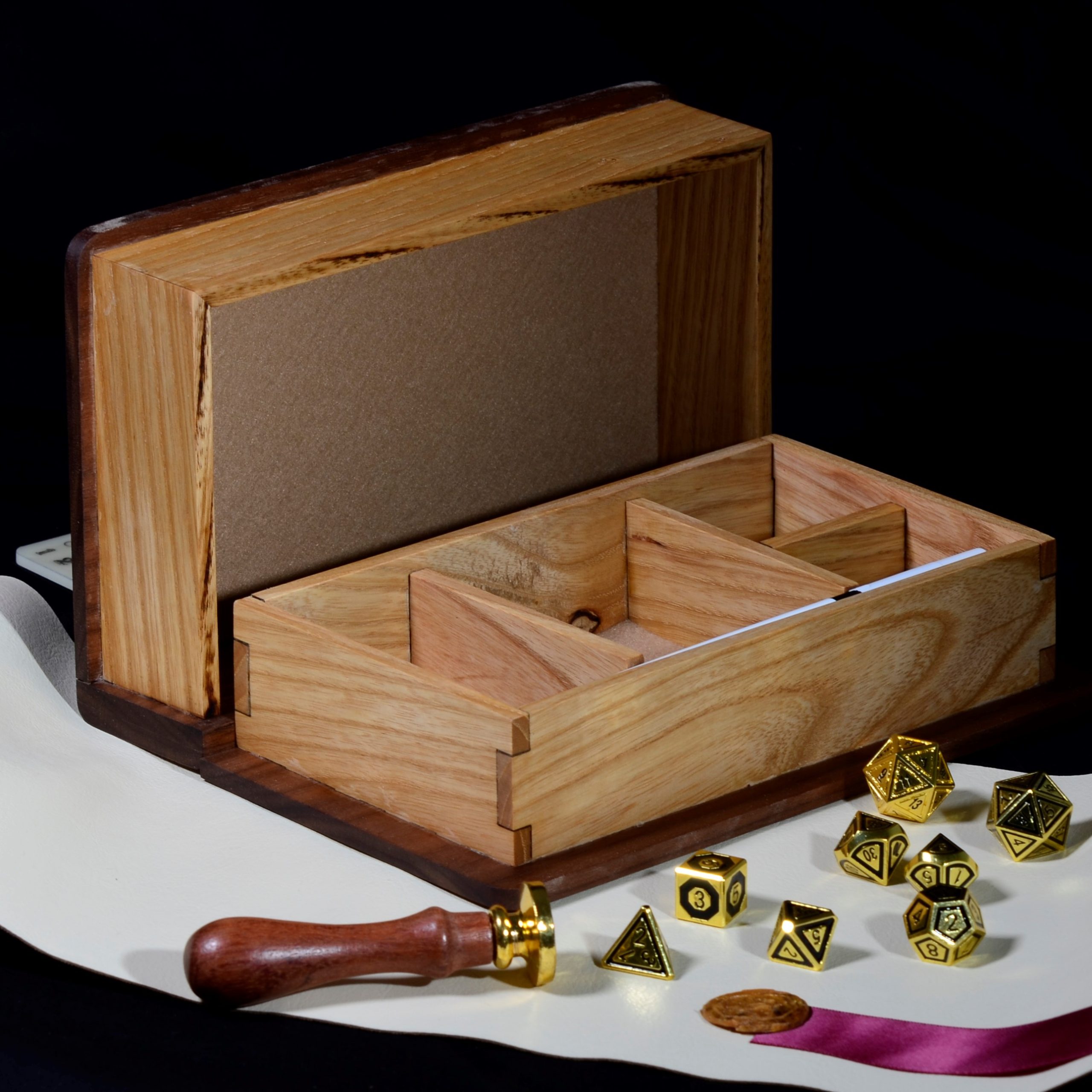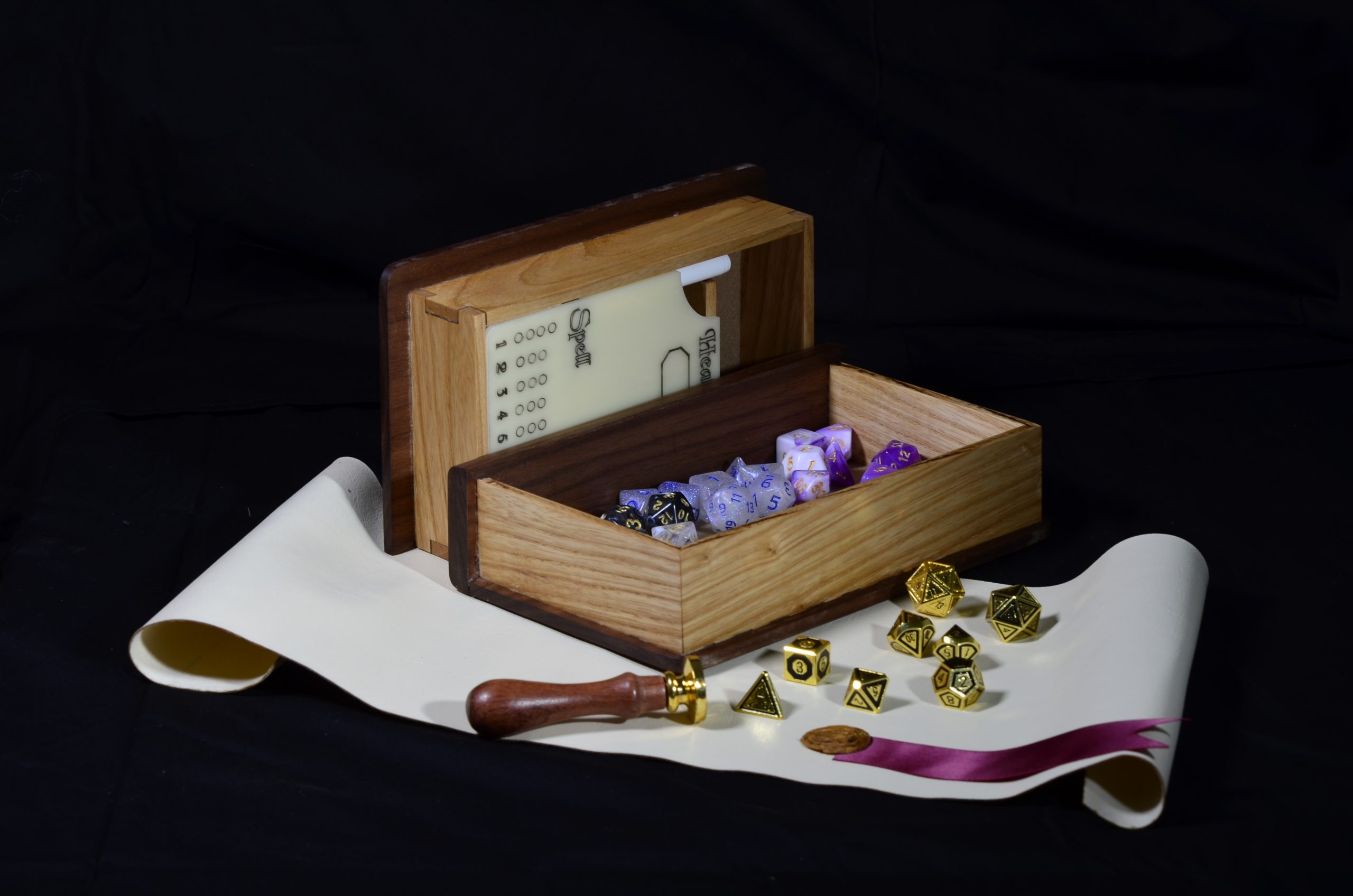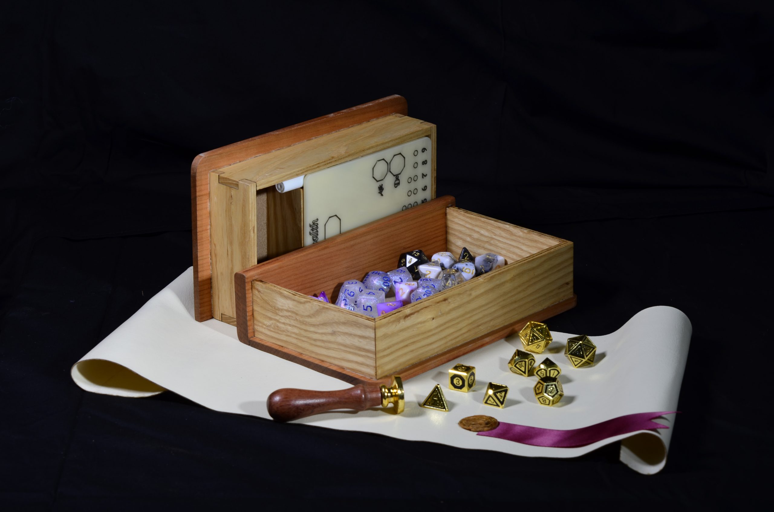 Only fine craftsmanship and friction keep this box secure and your cards safe on your travels. You can fit tokens, counters or d20’s in the storage section.