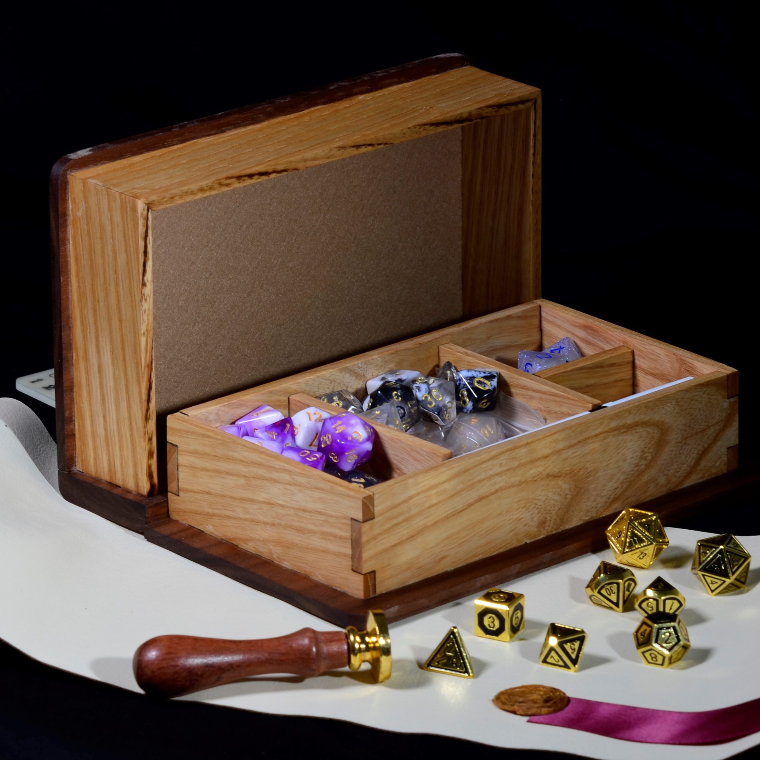 The ultimate storage solution for your DnD dice and miniatures. Our wooden box is handcrafted and features a magnetized lid to keep your treasures safe.