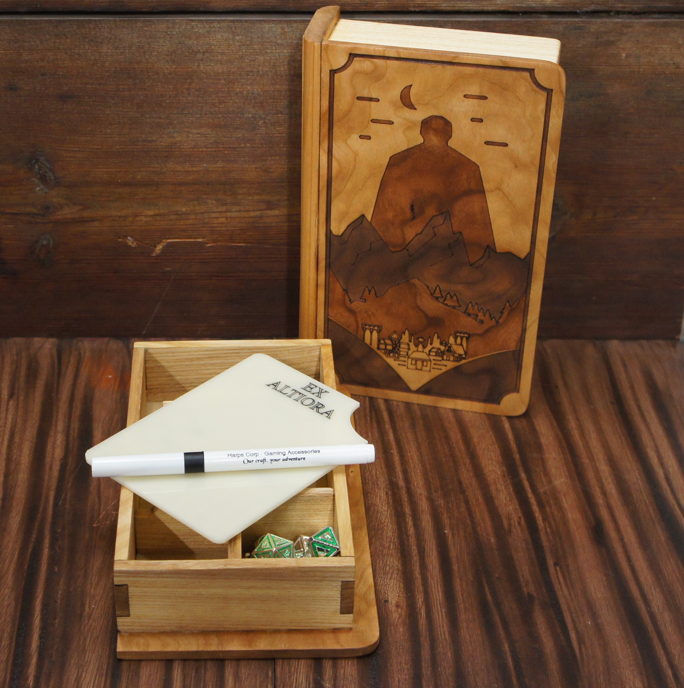 Our enchanted wooden dice box is the perfect solution for storing your DnD dice and miniatures. The magnetized lid keeps them secure.