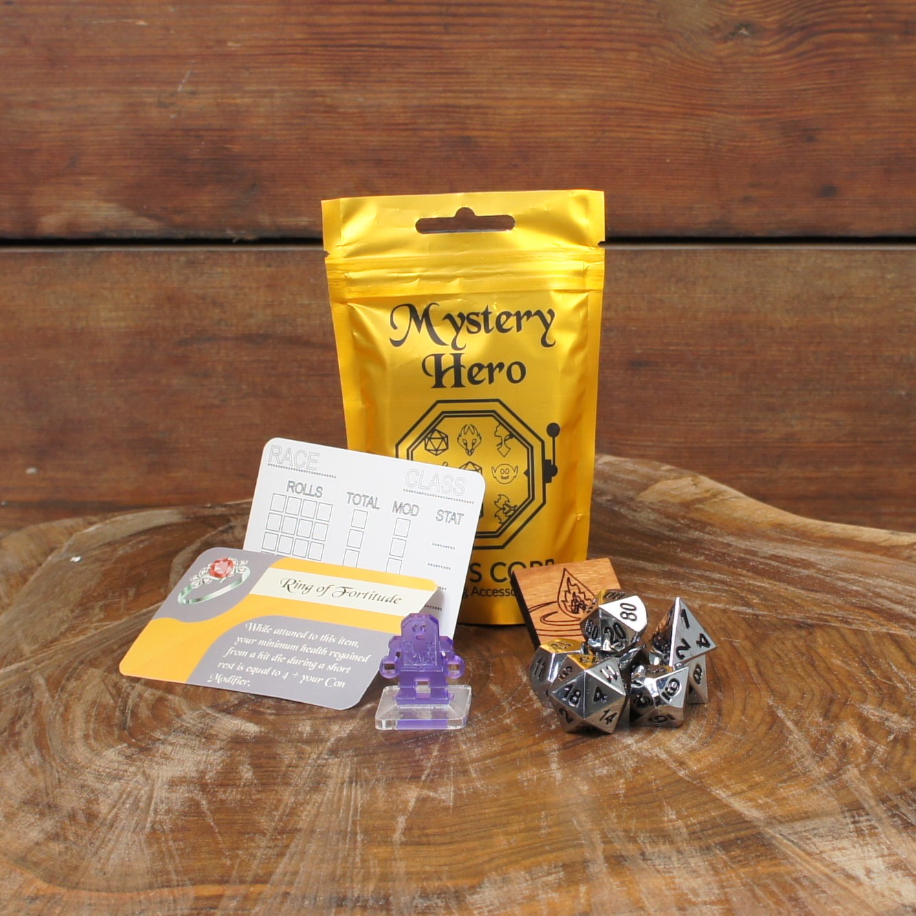 – 1 Full metal poly dice set (d20, d12, d10, d%, d8, d6, d4)