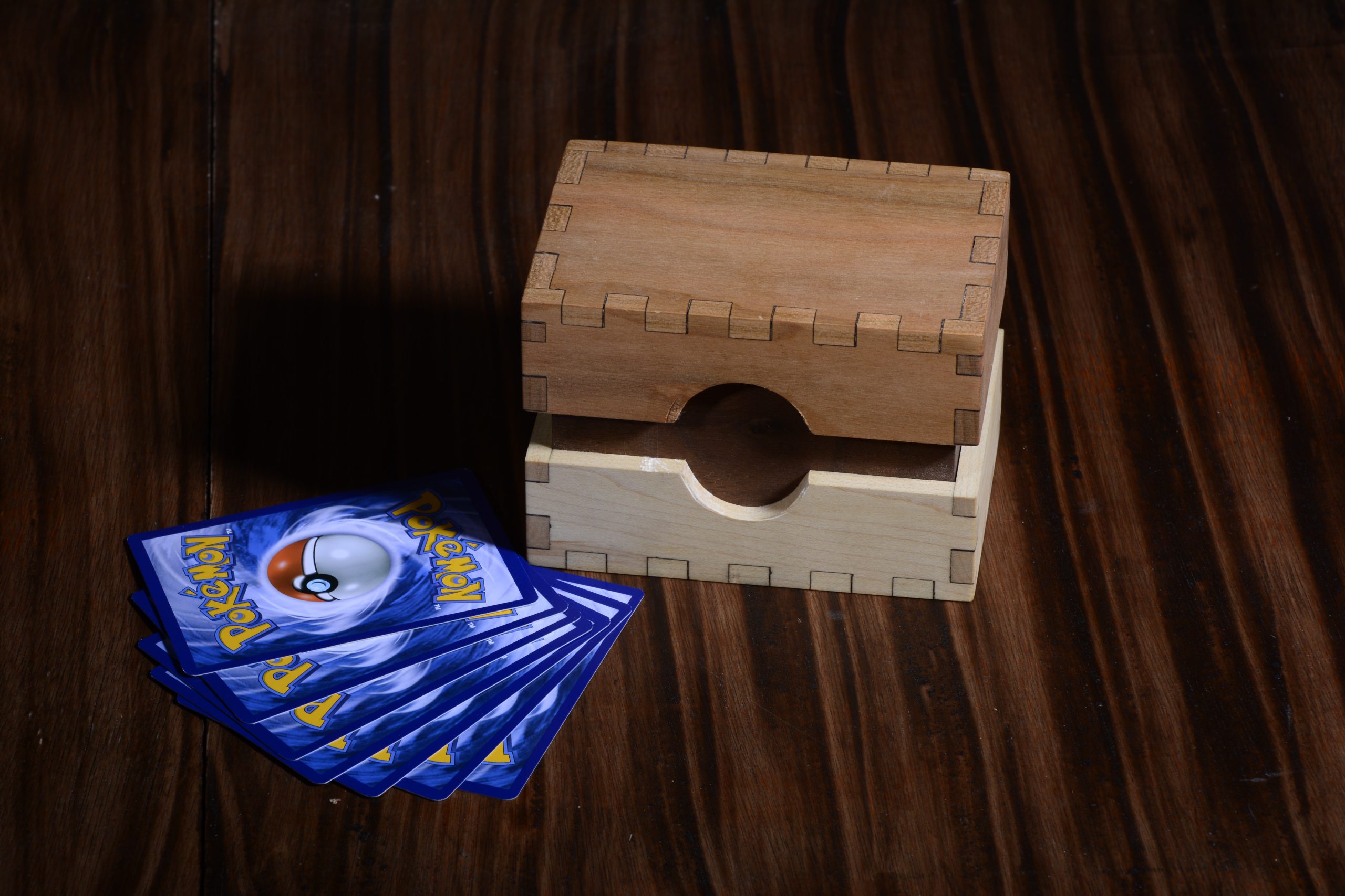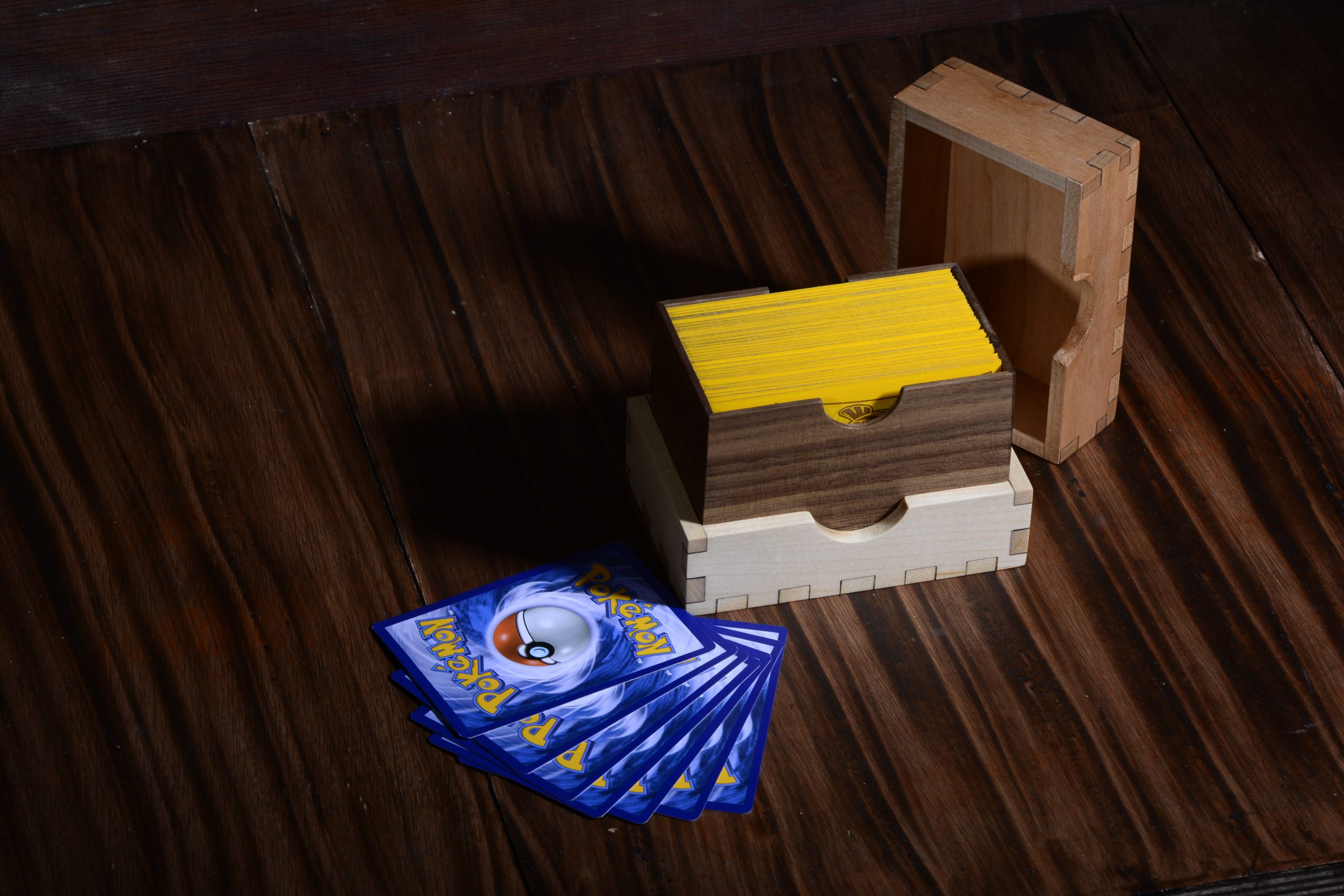 Store your prized possessions with this hand-crafted wooden deck box, perfect for MTG, Pokemon or any TCG players who value both functionality and beauty.