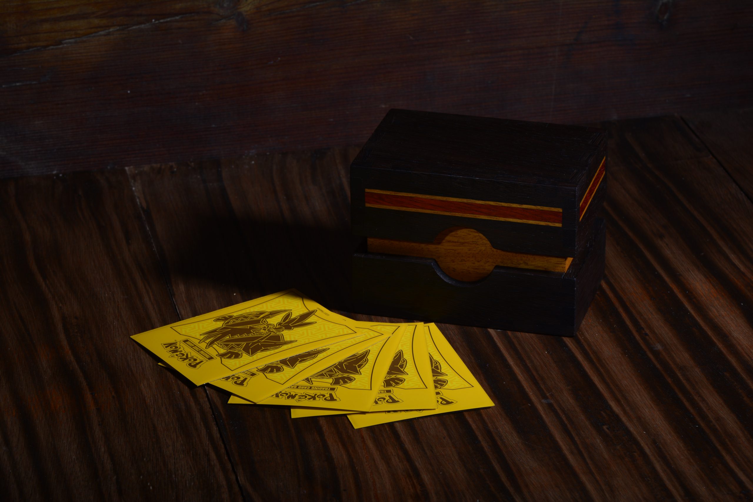Store your prized possessions with this hand-crafted wooden deck box, perfect for MTG, Pokemon or any TCG players who value both functionality and beauty.