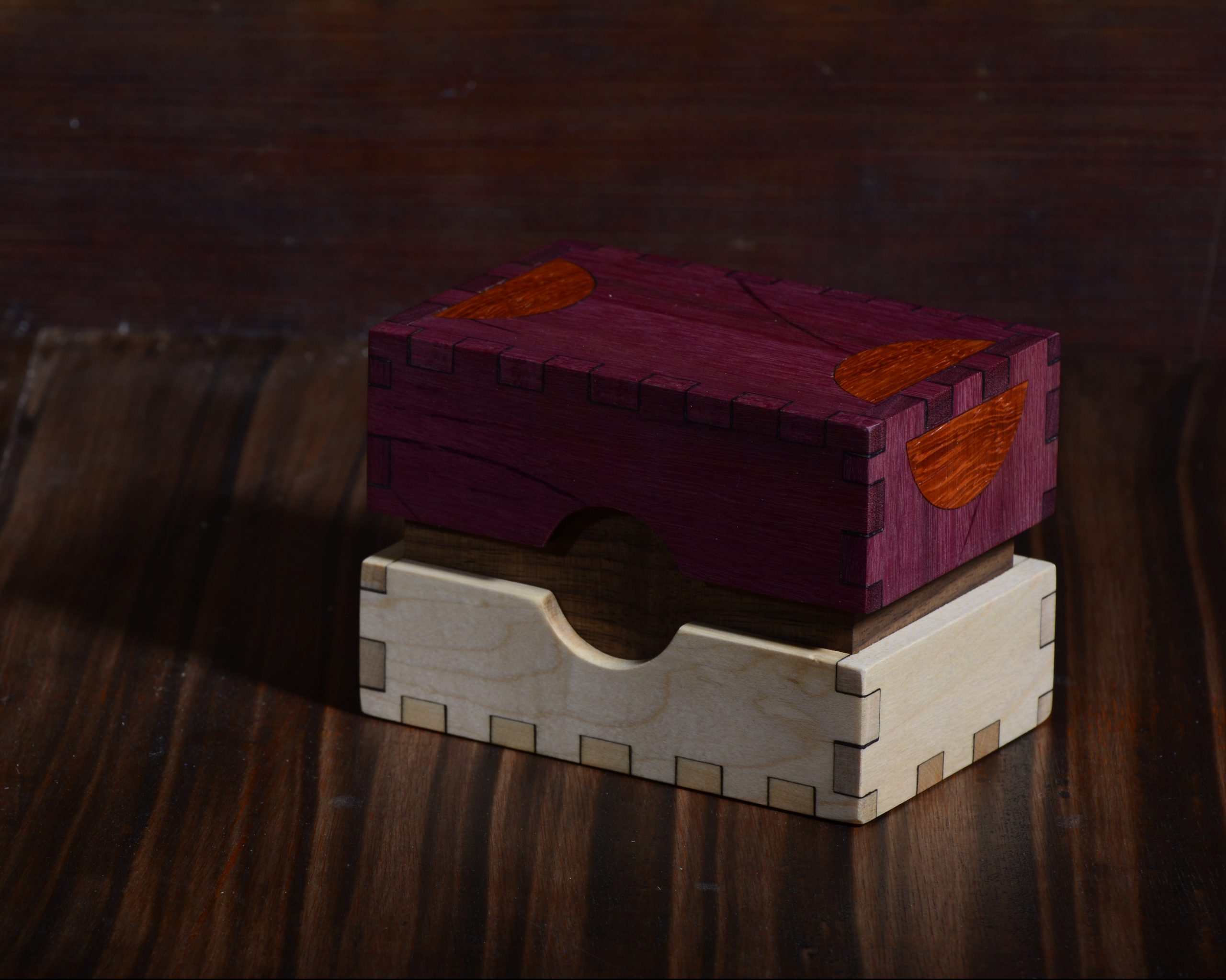 Made from gorgeous Purpleheart inlaid with Paduk, with Walnut insert and Maple base.