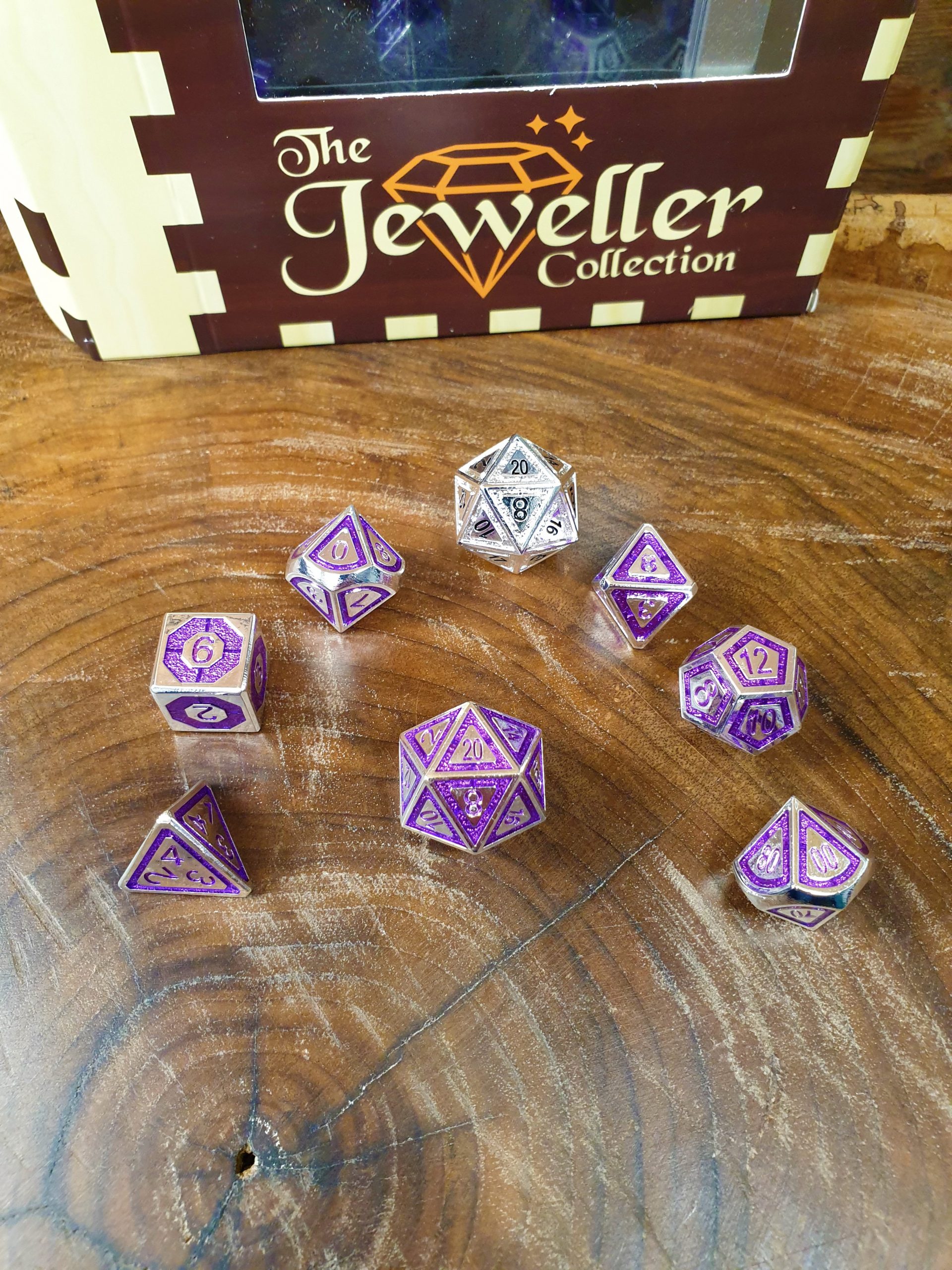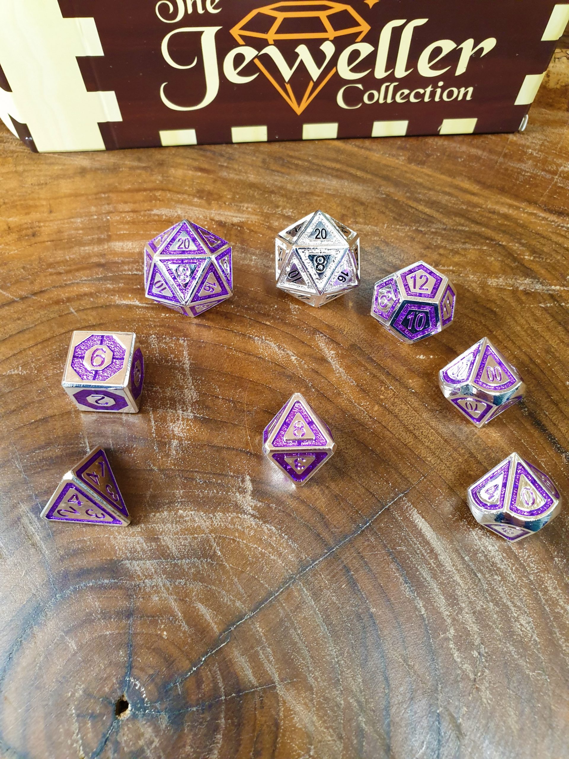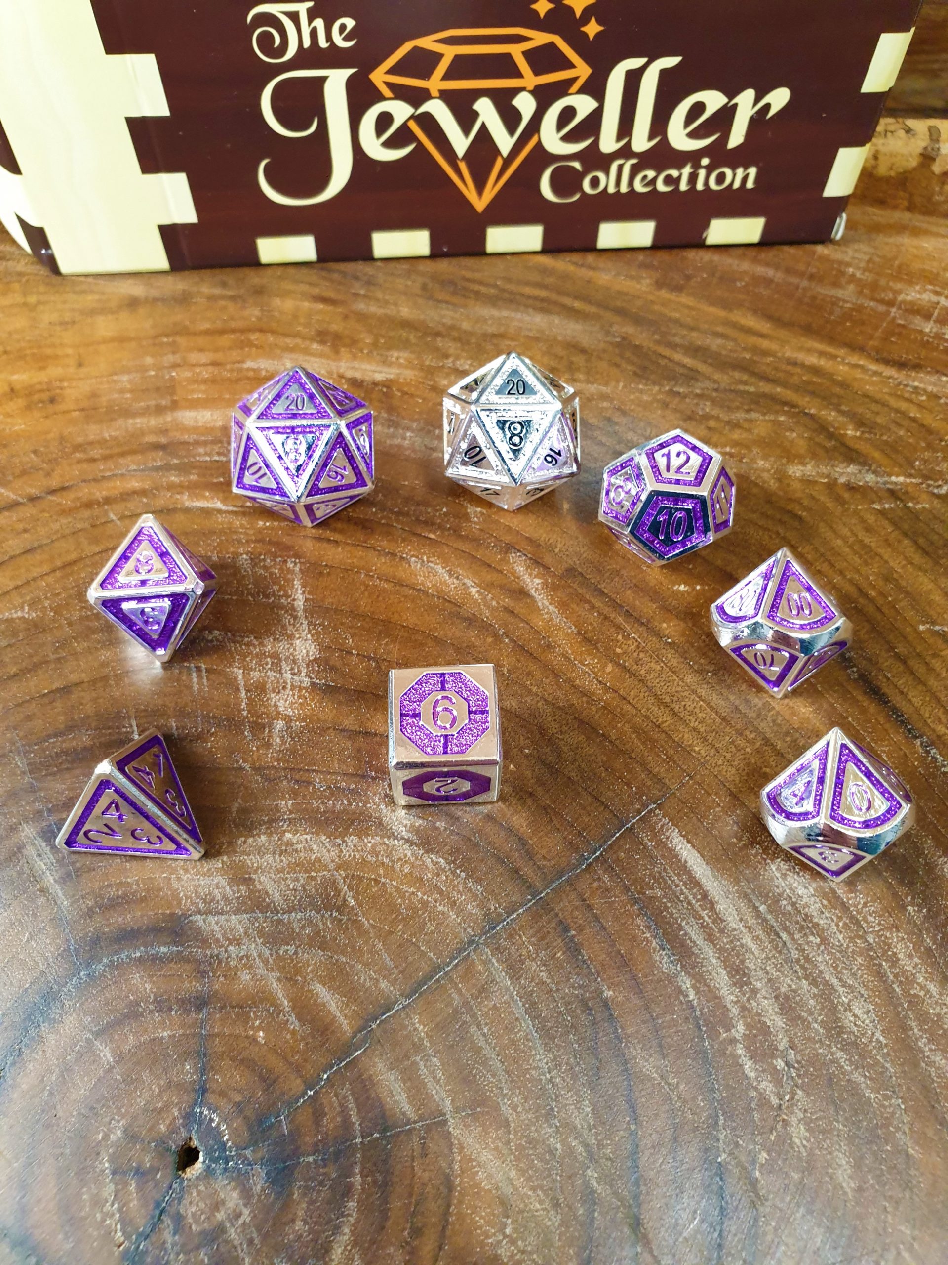 Premium metal RPG dice set contains 2x D20s, 1x D12, 1x D10, 1x D%, 1x D8, 1x D6 and 1x D4.