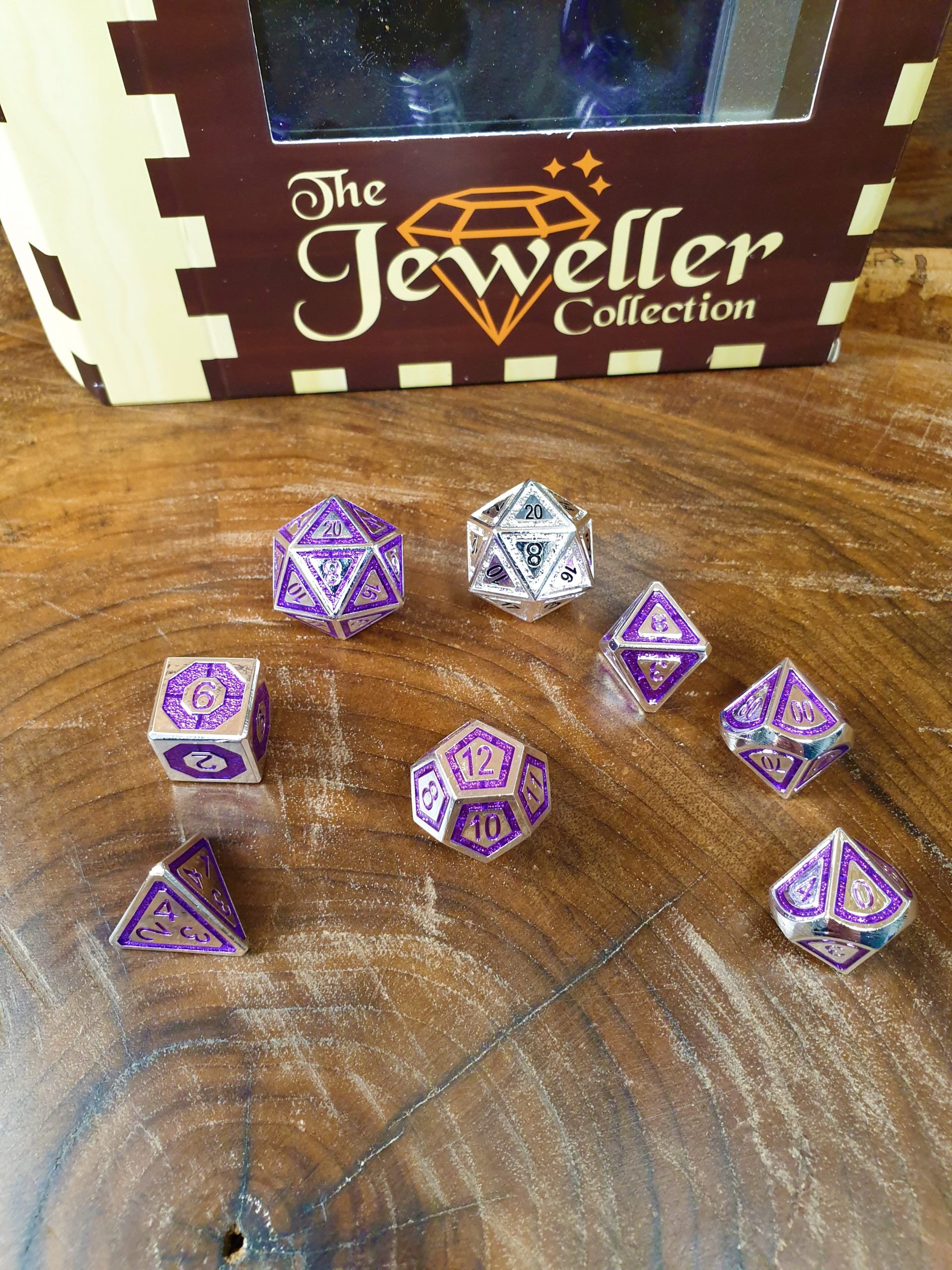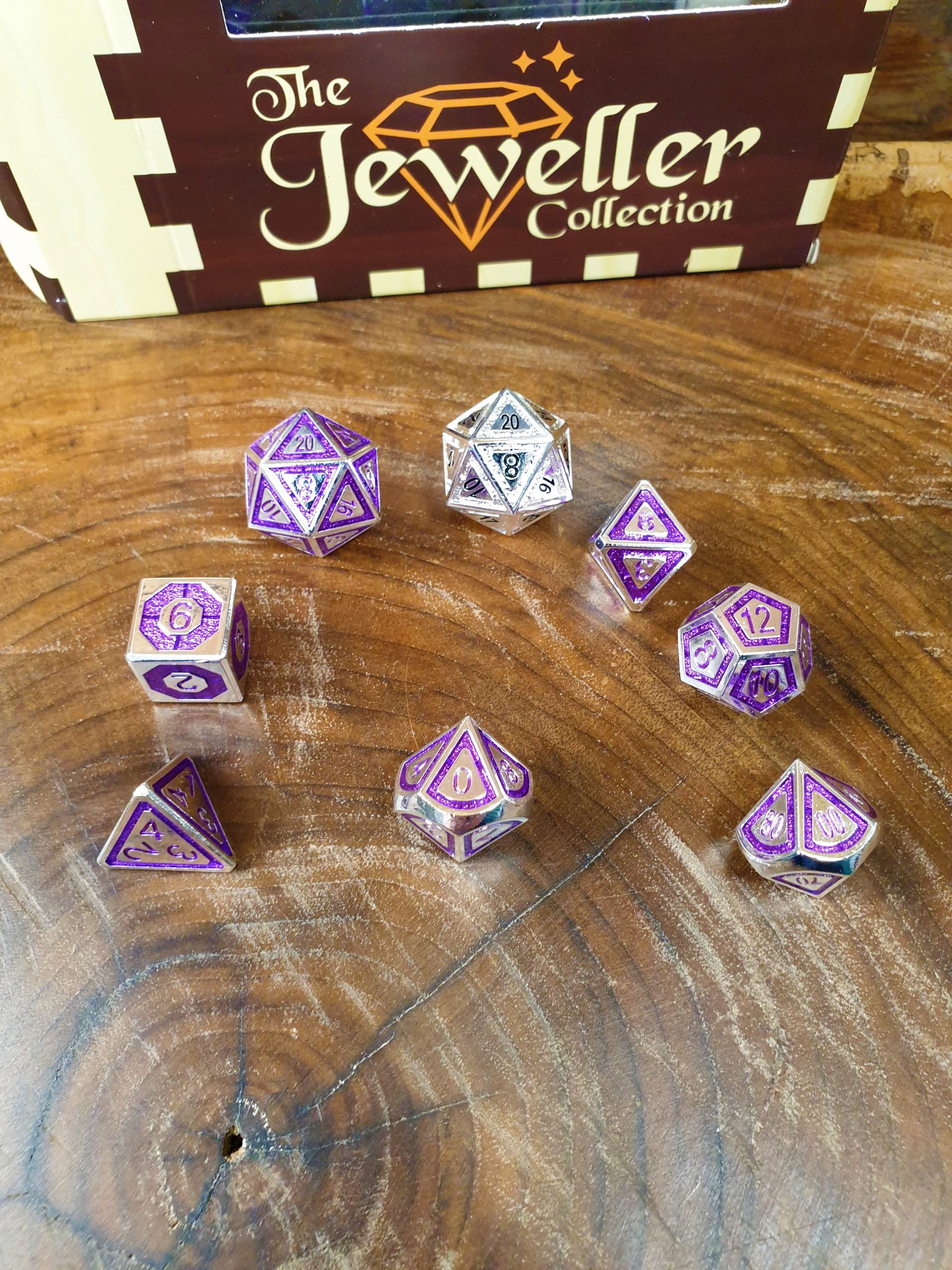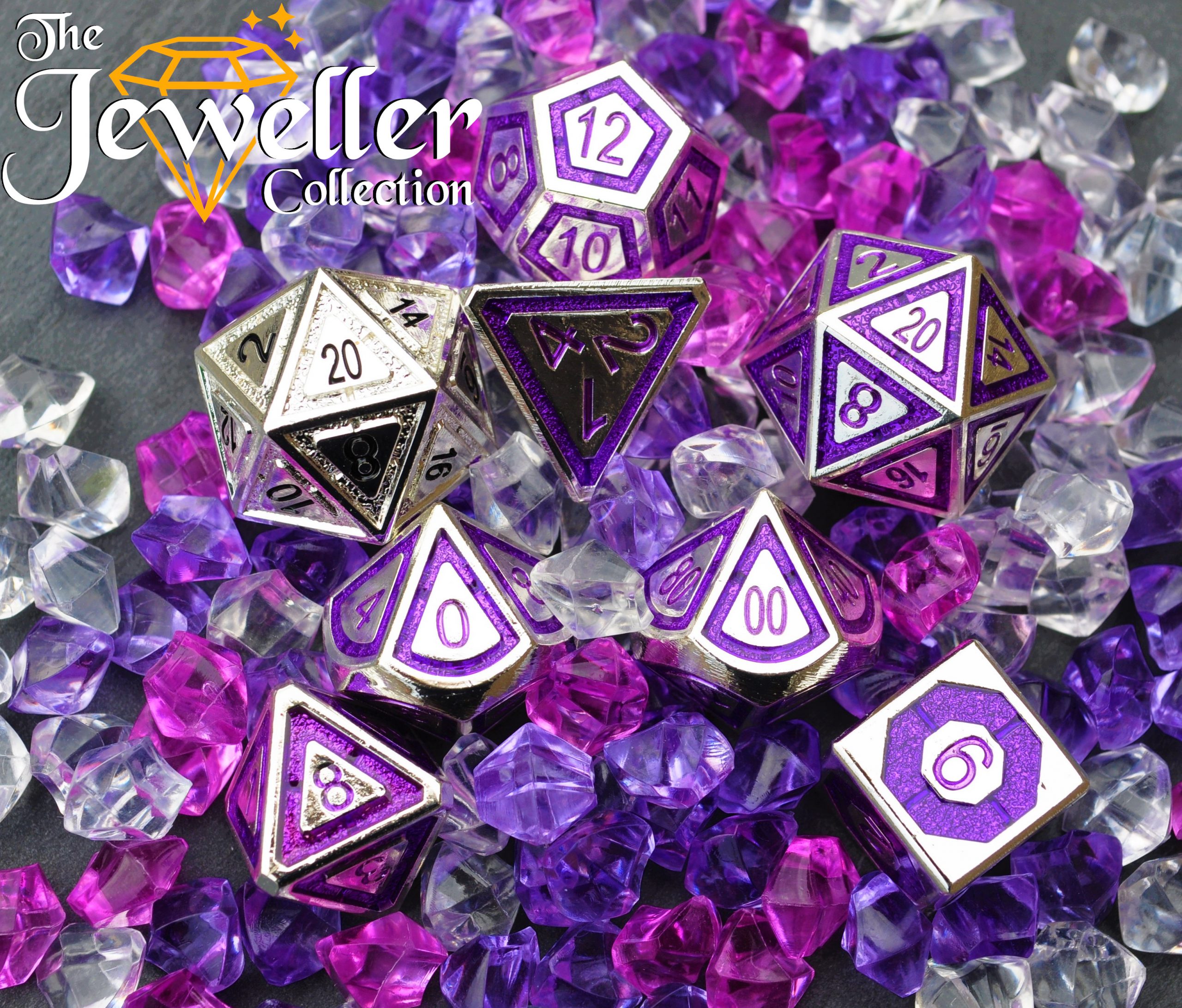 Premium metal RPG dice set contains 2x D20s, 1x D12, 1x D10, 1x D%, 1x D8, 1x D6 and 1x D4.