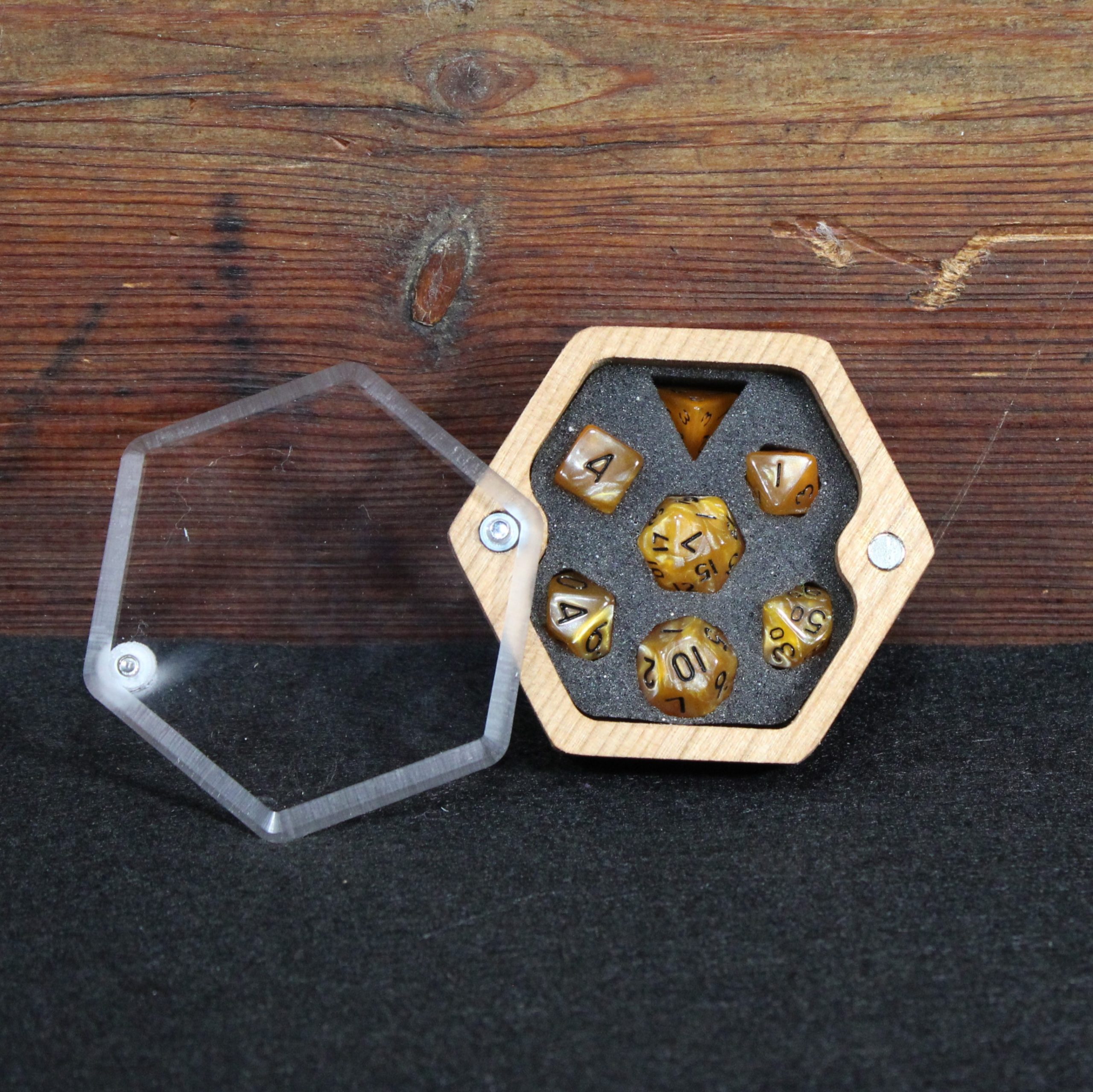 A random type hardwood display box with your choice of micro dice.
