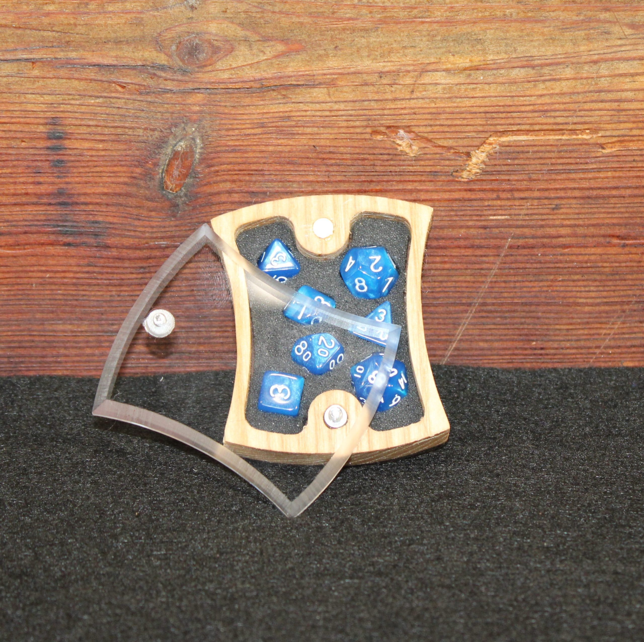 A random type hardwood display box with your choice of micro dice.