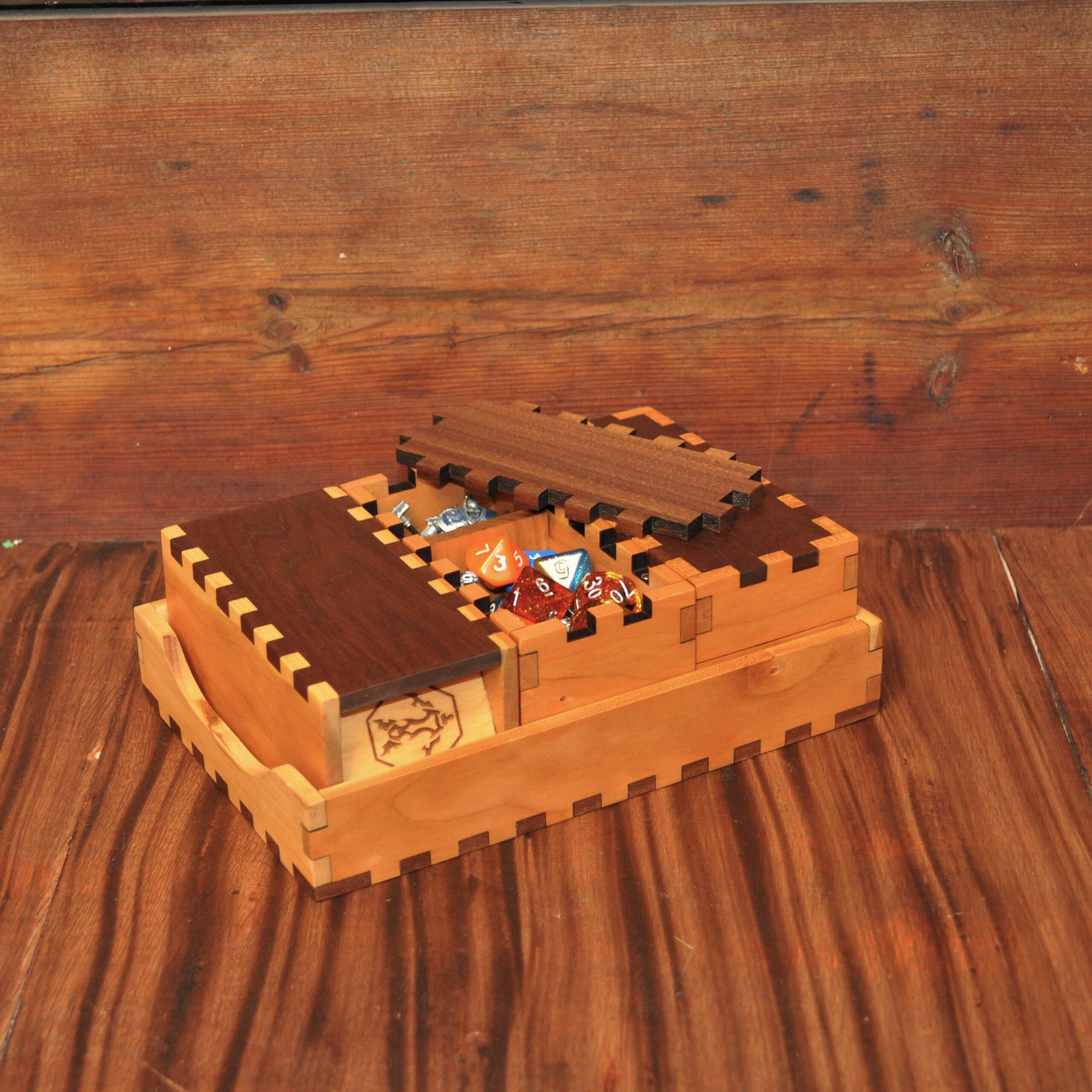 The Explorer preps you for any type of adventure. This modular dice tray is crafted from enchanted wood and is perfect for keeping everything you need safe. It can hold a selection of boxes, including a dice tower, dice box or dice jail.