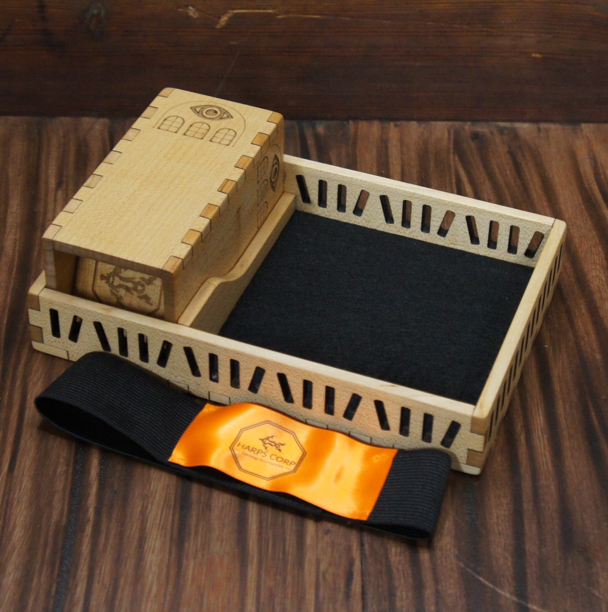 The Explorer preps you for any type of adventure. This modular dice tray is crafted from enchanted wood and is perfect for keeping everything you need safe. It can hold a selection of boxes, including a dice tower, dice box or dice jail.